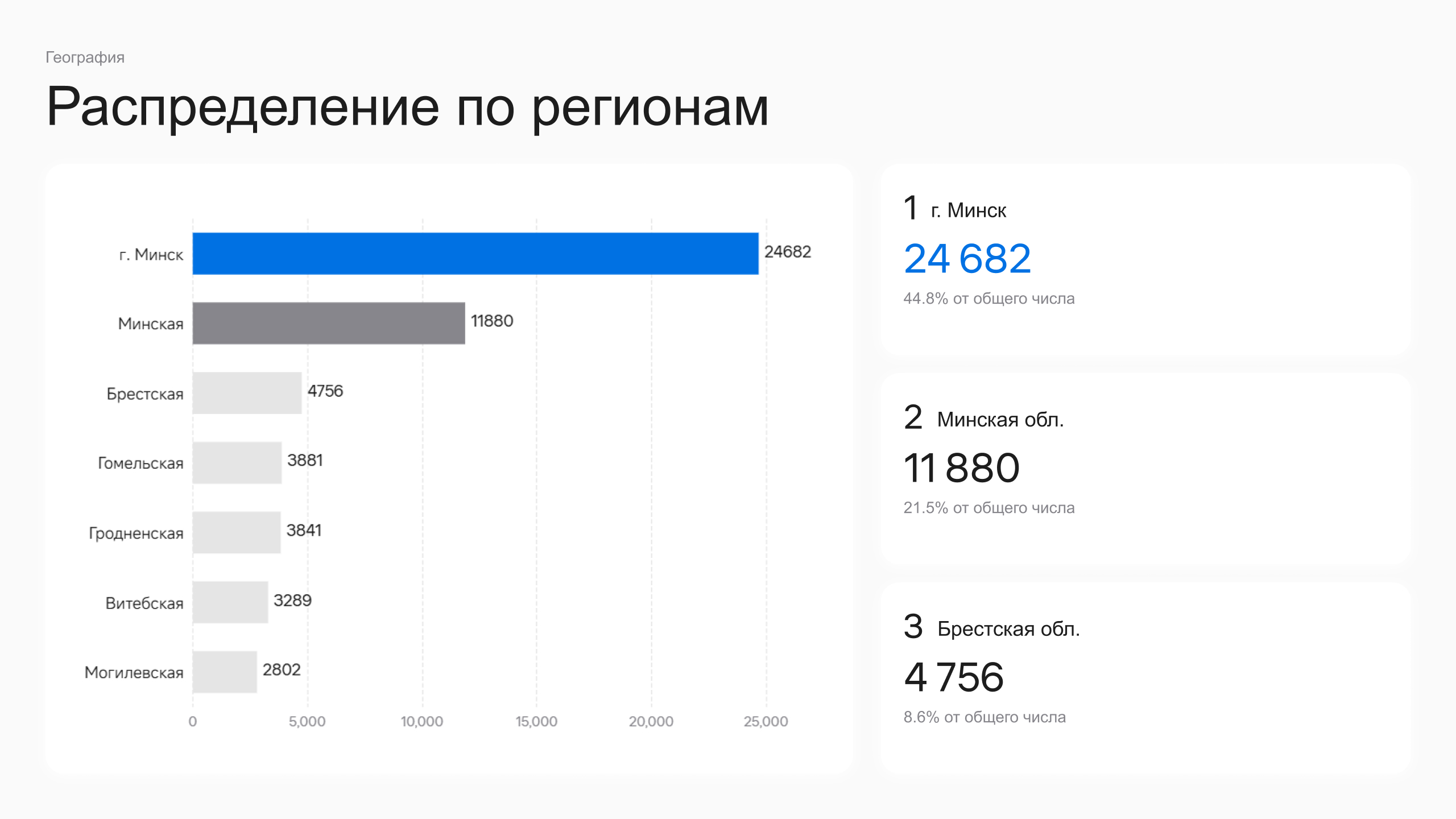 Второе место у Минской области – 11 880 (21,5%). Брестская область на третьем месте – 4 756 (8,6%).